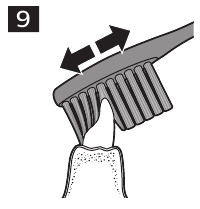 - While you maintain the angle of the bristles to the gumline, gently move the brush head slowly across the teeth in a small back and forth motion so the longer bristles reach between the teeth. Continue this motion throughout the brushing cycle (Fig. 9).