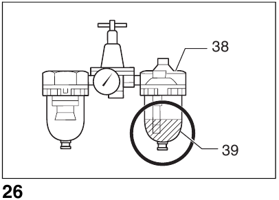 Check regularly to see if there is sufficient pneumatic oil in the oiler of the air set. Failure to maintain sufficient lubrication will cause O-rings to wear quickly. (Fig. 26)