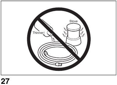 Keep the air hose away from heat (over 60°C, over 140°F), away from chemicals (thinner, strong acids or alkalis). Also, route the hose away from obstacles which it may become dangerously caught on during operation. Hoses must also be directed away from sharp edges and areas which may lead to damage or abrasion to the hose. (Fig. 27)