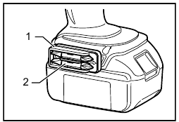 - To install the battery cartridge, align the tongue on the battery cartridge with the groove in the housing and slip it into place. Always insert it all the way until it locks in place with a little click. If you can see the red indicator on the upper side of the button, it is not locked completely. Install it fully until the red indicator cannot be seen. If not, it may accidentally fall out of the tool, causing injury to you or someone around you.