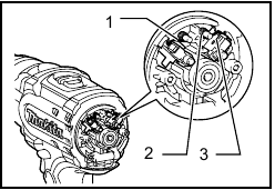 Replace when they wear down to the limit mark. Keep the carbon brushes clean and free to slip in the holders. Both carbon brushes should be replaced at the same time. Use only identical carbon brushes. Use a screwdriver to remove two screws then remove the rear cover.