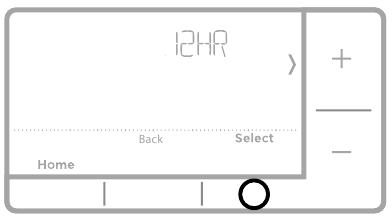 - 12HR is displayed. Press + or - to choose a 12 hour clock or a 24 hour clock. Press Select.