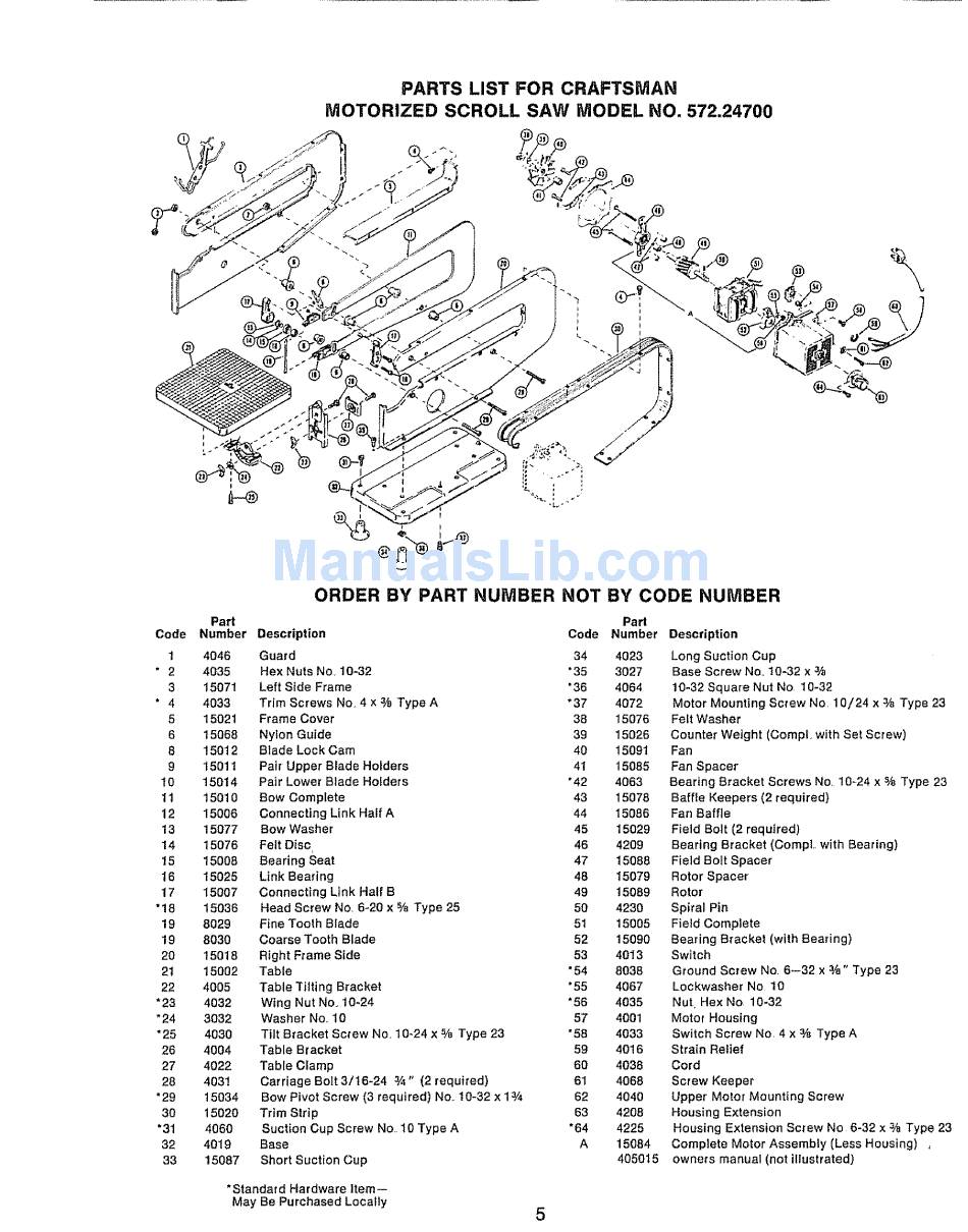 PARTS LIST FOR CRAFTSMAN