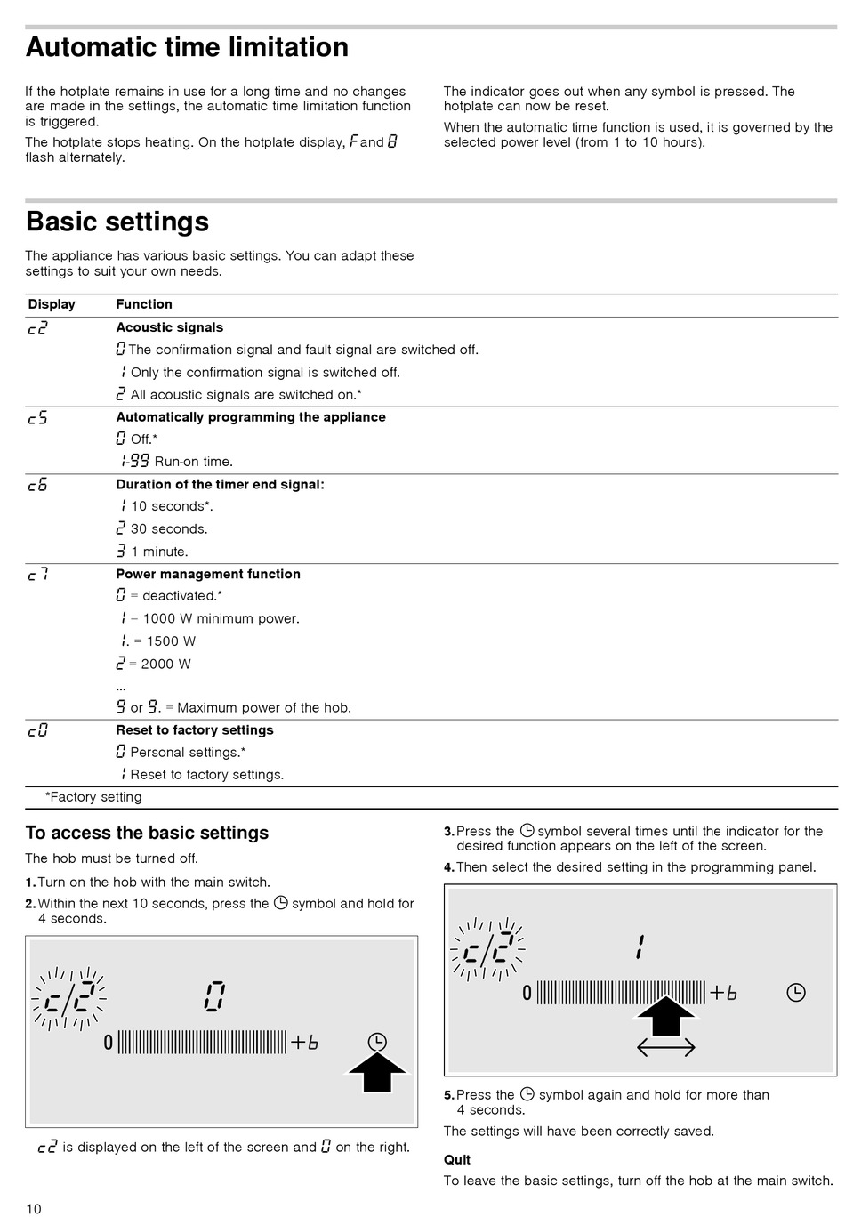 To leave the basic settings, turn off the hob at the main switch.