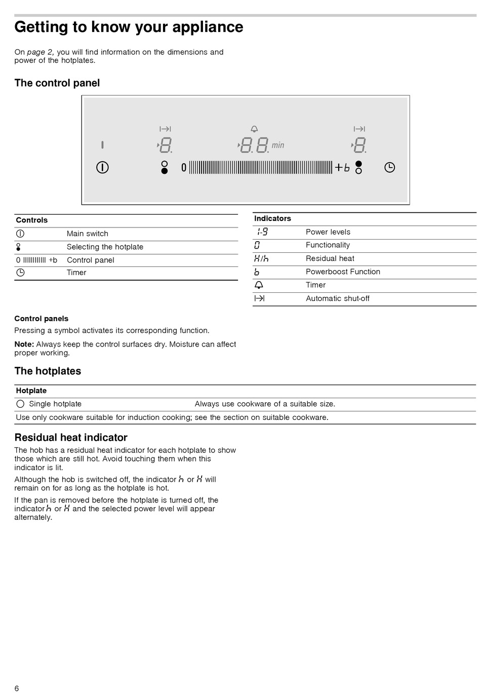 The hob has a residual heat indicator for each hotplate to show