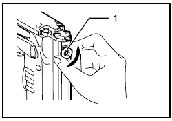 If the staples are driven too deep or too shallow, adjust the driving depth by turning the nut on the bottom of the tool. For deeper driving of staples, turn the nut clockwise. For shallower driving, turn the nut counterclockwise. Please note the nut must be turned in increments of 90° (1/4 turn) so that the groove on the nut runs parallel to the magazine.