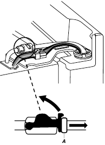 - Disconnect the water dispenser tubing located on top of the door hinge by firmly pulling up on the clasp. Then, pull the tubing out of the fitting.