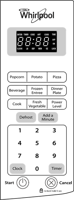 To Lock/Unlock Control: The microwave oven must be off. Touch and hold CANCEL for 5 seconds until the tones sound and the LOCK icon and "LoC" appear in the display. Repeat to unlock and clear the display (2 tones will sound).