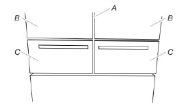When the drawer fronts are aligned, the width of the vertical space (A) between the refrigerator doors (B) and the drawer fronts (C) is the same thickness, and the drawers appear level.