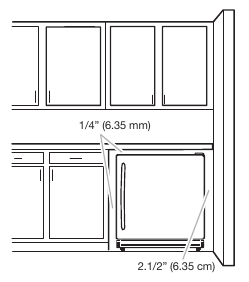 To ensure proper ventilation for your Refrigerator, allow for a 1/4" (6.35 mm) space on each side and at the top. When installing your Refrigerator next to a fixed wall, leave 2.1/2" (6.35 cm) minimum clearance on the hinge side to allow for the door to swing open.