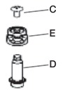 - Using the screwdriver, remove the screw (C) fastening the plastic hinge door latch (E). Set screw aside. Then, unscrew the bottom hinge shaft (D) and plastic hinge door latch (E) and set aside.