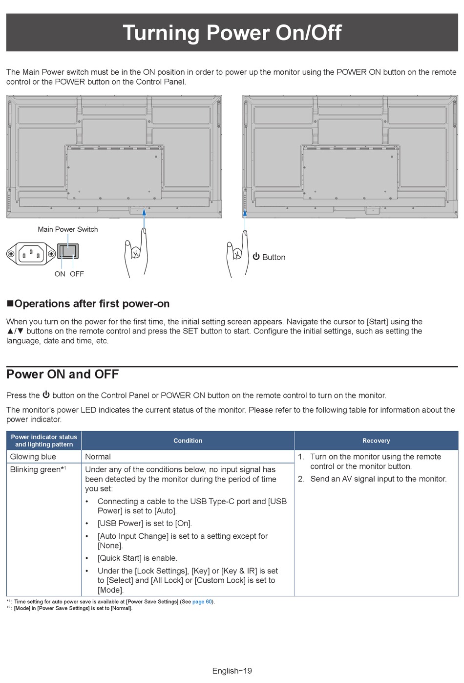 Press the ⏻ button on the Control Panel or POWER ON button on the remote control to turn on the monitor.