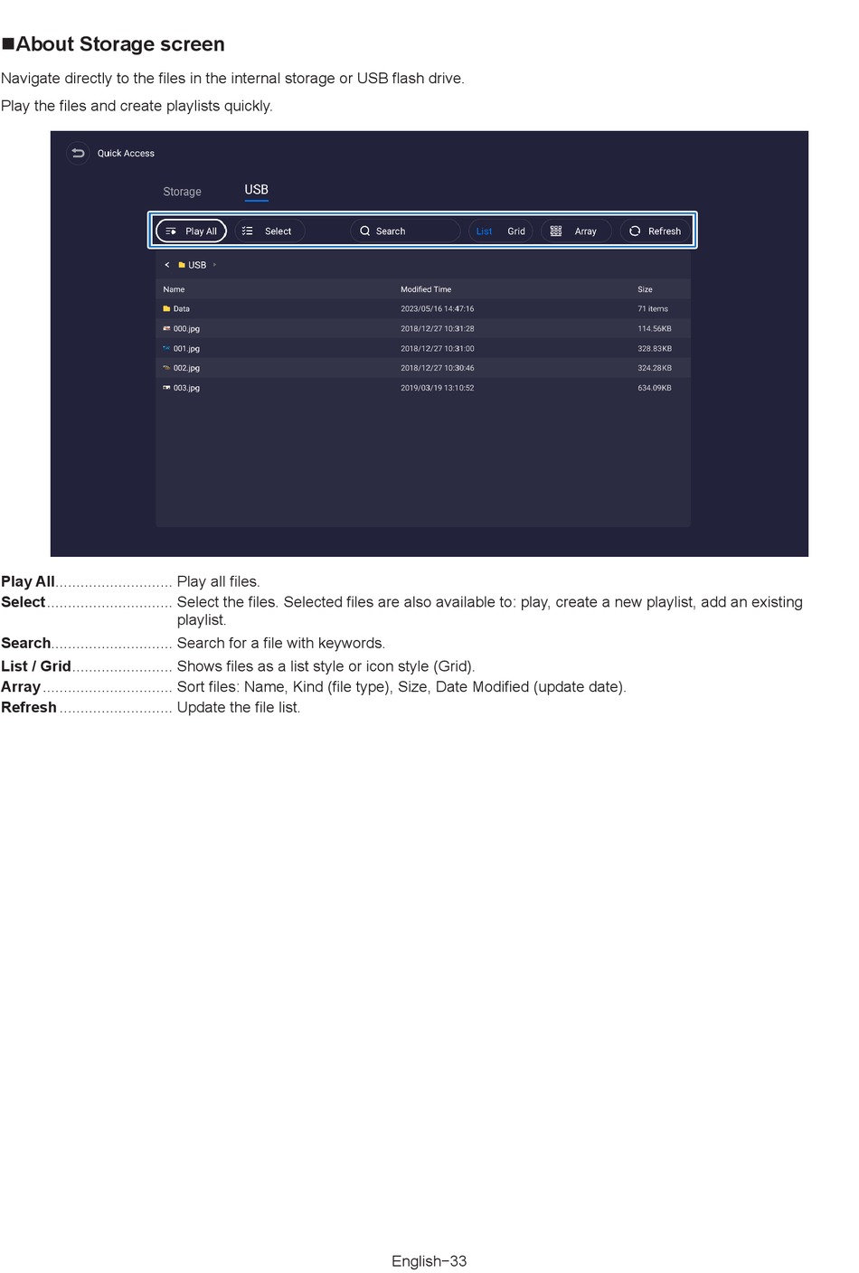 List / Grid ........................ Shows files as a list style or icon style (Grid).
