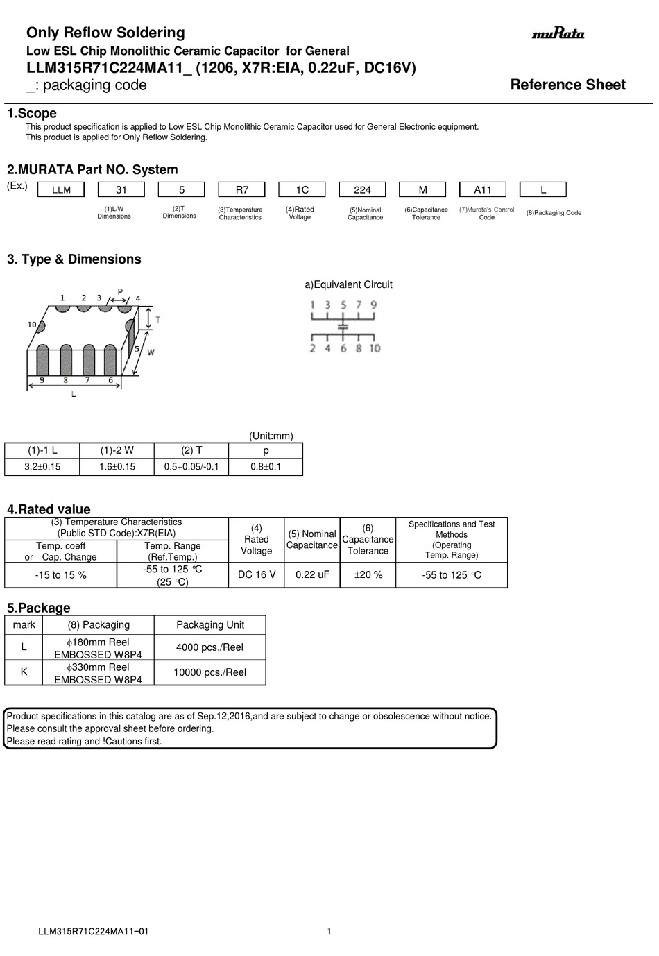 _: packaging code Reference Sheet 1.Scope This product specification is applied to Low ESL Chip Monolithic Ceramic Capacitor used for General Electronic equipment. This product is applied for Only Reflow Soldering. 2.MURATA Part NO. System (Ex.) (2)T (7)Murata’s Control (1)L/W (4)Rated...