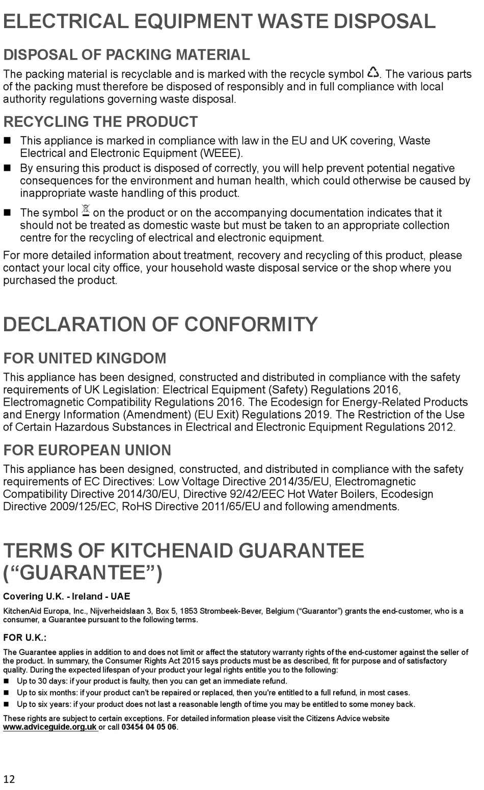 � This appliance is marked in compliance with law in the EU and UK covering, Waste