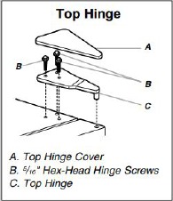 - Check all holes to make sure that hole plugs and screws are in place. Reinstall top hinge cover. See "Top Hinge" graphic.