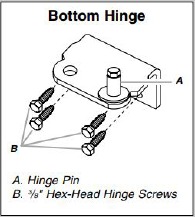 - Remove the four hex-head hinge screws and bottom hinge assembly. See "Bottom Hinge" graphic.