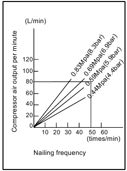- Select a compressor that has ample pressure and air output to assure cost-efficient operation. The graph shows the relation between nailing frequency, applicable pressure and compressor air output. Thus, for example, if nailing takes place at a rate of approximately 50 times per minute at a compression of 0.59 Mpa (5.9 bar), a compressor with an air output over 80 liters/ minute is required. Pressure regulators must be used to limit air pressure to the rated pressure of the tool where air supply pressure exceeds the tool's rated pressure. Failure to do so may result in serious injury to tool operator or persons in the vicinity.