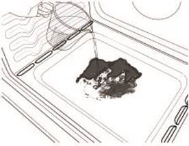 - Remove the residual water and loosened soils with a sponge or cloth immediately after the Clean cycle is complete. Much of the initial 2 cups (16 oz [500 mL]) of water will remain in the oven after the cycle is completed. If additional soils remain, leave a small amount of water in the oven bottom to assist with the cleaning.