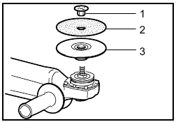 Mount the rubber pad onto the spindle. Fit the disc on the rubber pad and screw the lock nut onto the spindle. To tighten the lock nut, press the shaft lock firmly so that the spindle cannot revolve, then use the lock nut wrench and securely tighten clockwise.
