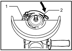 Loosen the lever on the wheel guard. Mount the wheel guard with the protrusion on the wheel guard band aligned with the notch on the bearing box. Then rotate the wheel guard around to the position shown in the figure. Tighten the lever to fasten the wheel guard. If the lever is too tight or too loose to fasten the wheel guard, loosen or tighten the nut by spanner to adjust the tightening of the wheel guard band.