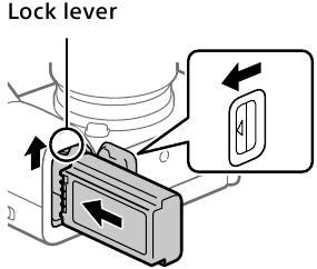 - Open the battery cover, and then insert the battery pack while pressing the lock lever.