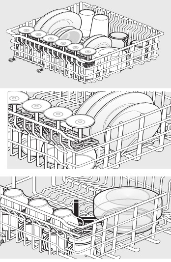 The lower rack is best for plates, saucers, bowls, and cookware. Large items should be placed along the edge so they do not block the spray arm rotation. For best results, place bowls, casseroles, and sauce pans with soiled surface facing down or toward the center. Tilt slightly for better drainage.