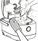 Please use dry cloth or baking gloves to remove the hot inner cooking pot.