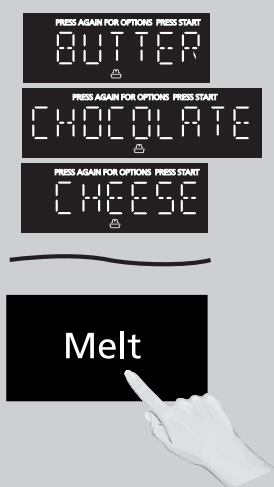 | CHOCOLATE | 7.0/10 Oz (200/300g) | Chocolate chips or squares of baking chocolate may be used. Unwrap squares and place in microwavable container. Stir at the end of cycle to complete melting. |