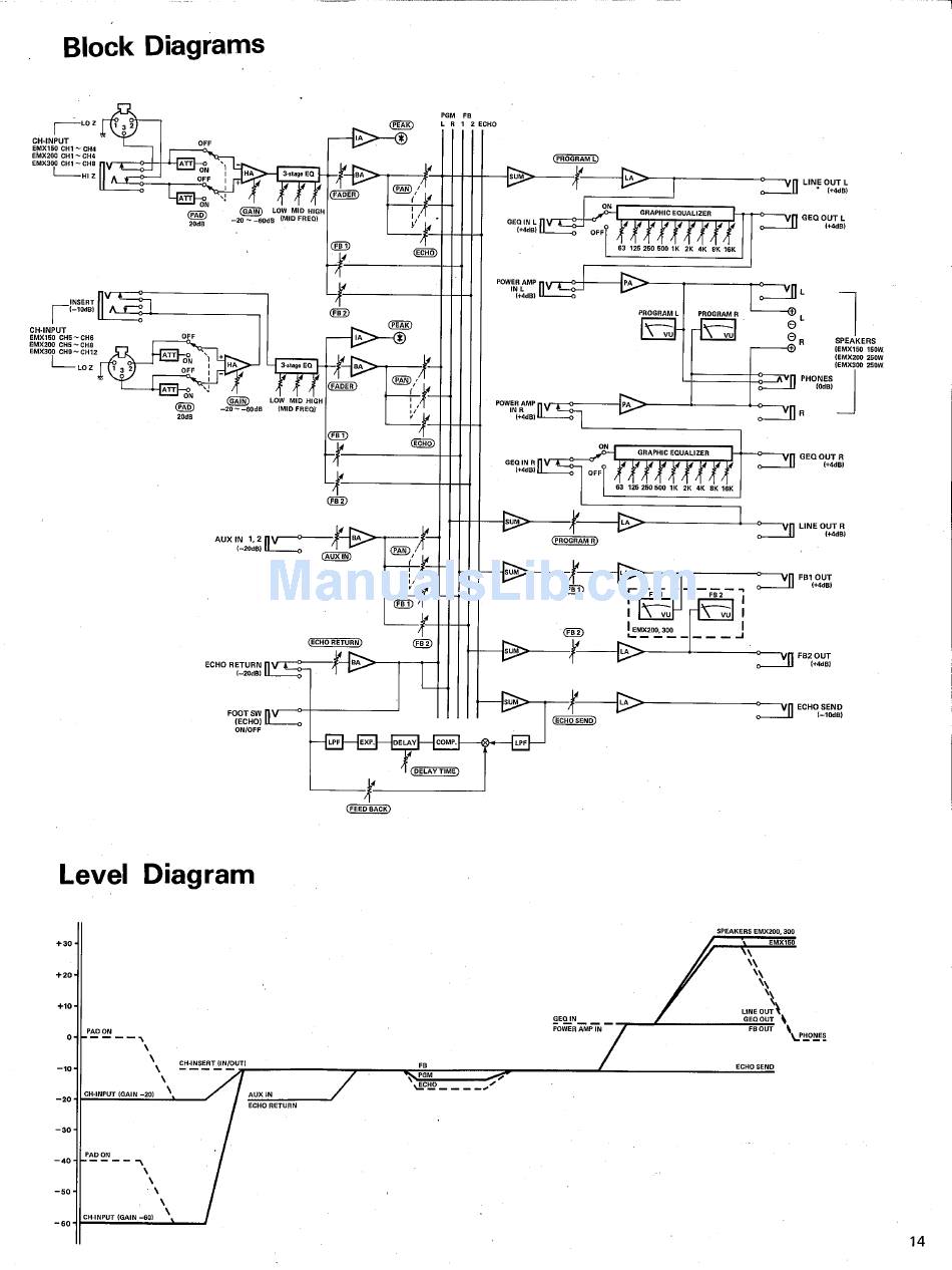 Block Diagrams; Level Diagram - Yamaha Emx200 Operating Manual