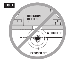 Do not feed the workpiece into the bit where the majority of the workpiece is between the fence and the bit. This creates a "fence trap" which is a hazardous situation due to the bit being exposed. This will cause the work to "climb-cut" away from the tabletop and may lead to loss of control during operation.