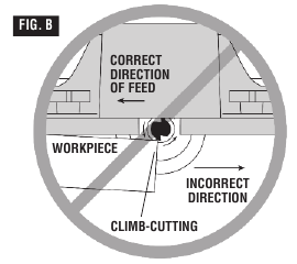 Feed the workpiece only against the rotation of the bit. Do not "back feed" the workpiece into the bit. The bit rotates counterclockwise as viewed from the top of the table. "Back feeding" will cause the workpiece to "climb" up on the bit, pulling the workpiece and possibly your hands into the rotating bit.