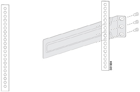 - Holding the chassis level, insert screws (12-24 or 10-32, depending on the rack type) in each of the two front rack-mount brackets (using a total of six screws) and into the cage nuts or threaded holes in the vertical rack-mounting rails (see the following figure).