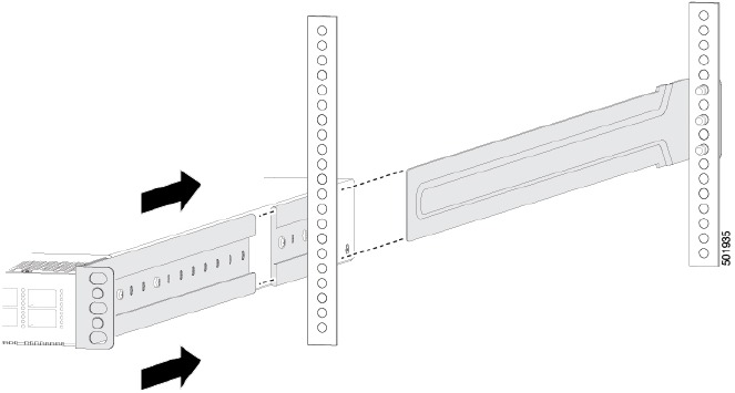 - Holding the switch with both hands, position the two rear rack-mount brackets on the switch between the rack or cabinet posts that do not have slider rails attached to them (see the following figure).