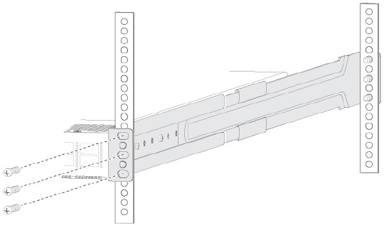 - Position a slider rail at the desired level on the back side of the rack and use 12-24 screws or 10-32 screws, depending on the rack thread type, to attach the rails to the rack (see the following figure). Tighten 12-24 screws to 30 in-lb (3.39 N·m) of torque and tighten 10-32 screws to 20 in-lb (2.26 N·m) of torque.
