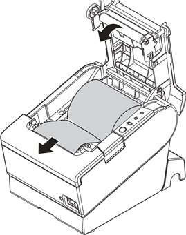 When a paper jam occurs, never pull out the paper forcibly. Open the roll paper cover and remove the jammed paper.