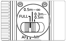 You can switch the focusing distance range to one of three settings: FULL (0.3 m/1.0 ft. to infinity), 0.3 m/1.0 ft. to 0.5 m/1.6 ft., or 0.5 m/1.6 ft. to infinity.