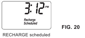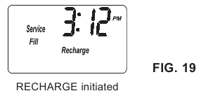 The softener enters the fill cycle of regeneration right away. "RECHARGE" will flash during the regeneration. When completed, full water conditioning capacity is restored. While water softener is running a recharge, the time remaining until the recharge is completed will show in the display during all cycles except for the Fill cycle.