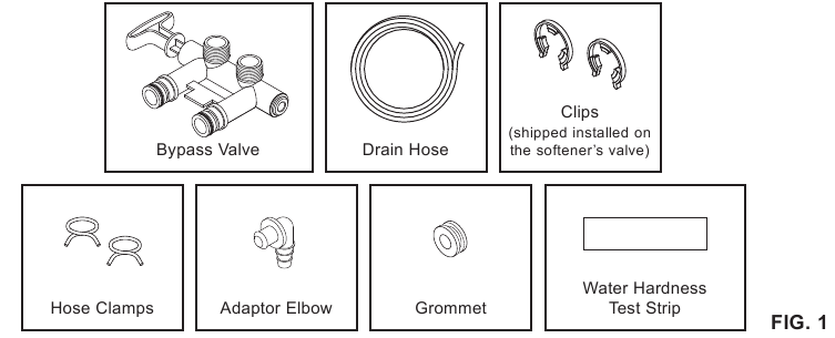 The parts required to assemble and install the water softener are included with the unit. Thoroughly check the water softener for possible shipping damage and parts loss. Also, inspect and note any damage to the shipping carton.