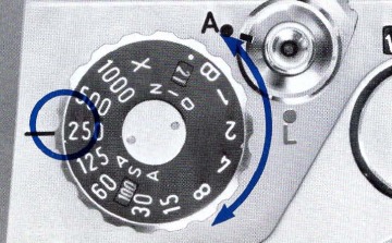 - For time exposures first set the shutter speed dial at "B". Keep the shutter release button pressed, and turn the time lock lever to "L". The shutter remains open even if the finger is removed from the button. When the lever is returned to "A", the shutter closes.