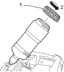 Slide the tank holder all the way over the motor housing so that the notch of the band (part of the tank holder) is positioned just below the screw head of the tool as illustrated.