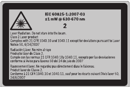 Do not direct the laser beam at persons or animals and do not stare into the laser beam yourself. This tool produces laser class 2 laser radiation and complies with 21 CFR 1040.10 and 1040.11 except for deviations pursuant to Laser Notice No. 50, dated June 24, 2007. This can lead to persons being blinded.