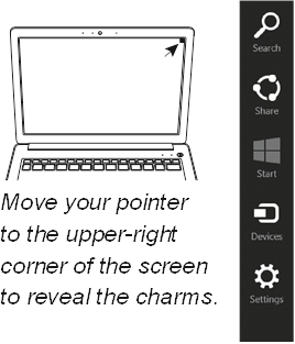 Move your pointer to the upper-right corner of the screen or swipe in from the right edge to reveal the charms.