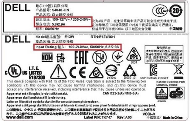 Attach the DC rating labels to the S4048–ON Regulatory label on the bottom of the switch.