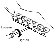 Clockwise screw rotation tightens the machine. The tuning machines should be adjusted to the extent that they are firm, but can turn smoothly. This adjustment is normally unnecessary, and excessive tightening can lead to premature tuning machine wear.