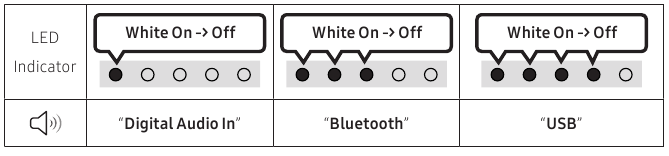 | (Sound Control) By pressing the button, you can set the audio function. The desired item can be adjusted using the Up/ Down buttons. Each time the mode changes, the Multicolour LED blinks in white. | LED Indicator | | | "Sync"→ "Night mode" →"Voice enhancement" | - If the video on the TV and audio from the Soundbar are not synchronised, select "Sync" in Sound Control, and then set the audio delay between 0~300 milliseconds by using the Up/Down buttons. (Not available in "USB" or "Bluetooth"mode.)