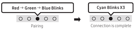 | Bluetooth PAIR Switch the Soundbar to Bluetooth pairing mode. When you press the button, the LED display changes as shown below. - Until pairing is complete, the Multicolour LED changes as Red → Green → Blue in turn.