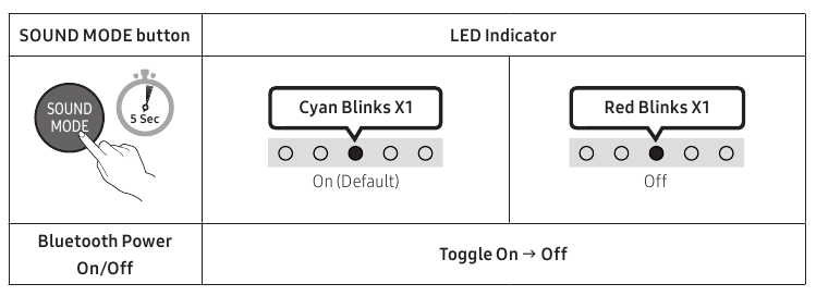 Bluetooth Port deactivation method | Press and hold the SOUND MODE button for more than 5 seconds to turn off Bluetooth Power function. |