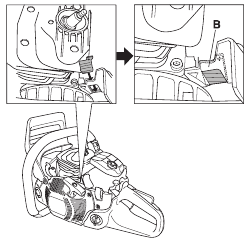 Move the cover from position A to position B so that preheated air from the cylinder can pass into the carburettor compartment and prevent, e.g. the air filter icing up again. When fitting the winter cover in position B the centrifugal cleaning nozzle is blocked. This measure requires the air filter to be cleaned more regularly.