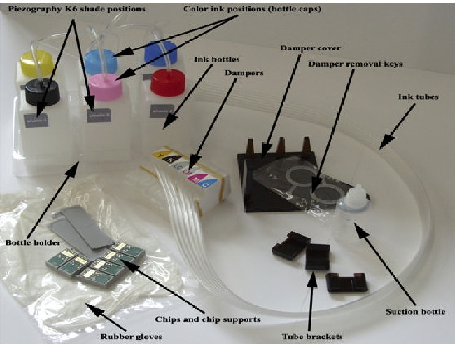 - Pull ink from bottles to fill tubes. To do this, squeeze the suction bottle and insert the tip of the bottle into the bottom hole of a damper. Press the tip of the bottle tightly into the damper hole to get a good seal then release the bottle so it pulls ink from the bottle thru the tube and to the damper.